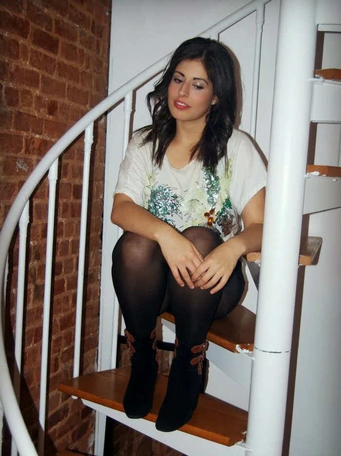 Shira is wearing a vintage sequined top from Israel, H&M shorts, and Anthroplogie booties. I love the shorts over tights look and am quite a fan of all things Anthropologie.
